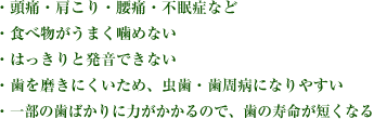 かみ合わせの不良は、下記のような症状をもたらす場合があります。